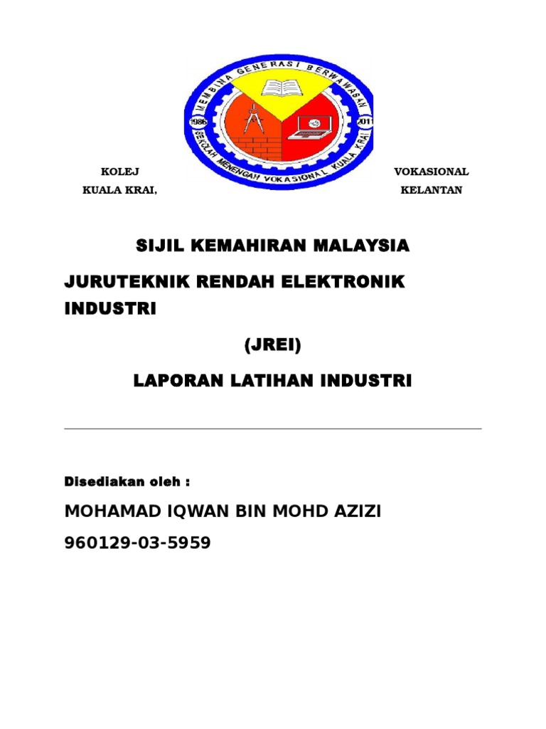 Presentation laporan latihan industri kktm rembau khalid jauhar. A) maklumat tentang tadika : Industri yang terpilih ialah pejabat daerah dan tanah larut matang dan selama (pdtlms). Apabila tamat latihan industri yang dijalankan disebuah firma tersebut itu, maka setiap pelajar diharuskan membuat atau menyediakan laporan lengkap dan mengikut piawaian yang telah ditetapkan oleh pihak politeknik.ia adalah bertujuan untuk menilai sejauh manakah keberkesanan latihan. Muka depan laporan akhir latihan industri. Laporan akhir latihan industri ini dikemukakan kepada pensyarah penilai di jabatan kejuruteraan elektrik bagi memenuhi sebahagian dari syarat penilaian latihan industri dan penganugerahan diploma kejuruteraan. Borang penilaian laporan akhir dan tugasan khusus. Semoga laporan latihan laporan latihan industri ini disediakan untuk kursus kejuruteraan industri ini dapat memberi manfaat kepada saya dan juga warga ikm mekanikal (lukisan & rekabentuk), institut kemahiran mara jasin, jasin secara keseluruhannya. Siti nurhakimah binti mohd wadzir a130153. Oleh itu, 5 laporan harian wajar diletakkan didalam satu muka surat sahaja dengan dibahagikan mengikut hari. Jabatan kerja raya negeri sembilan. Borang penilaian keseluruhan latihan industri. Contoh muka depan laporan yang bercetak adalah seperti di lampiran a.