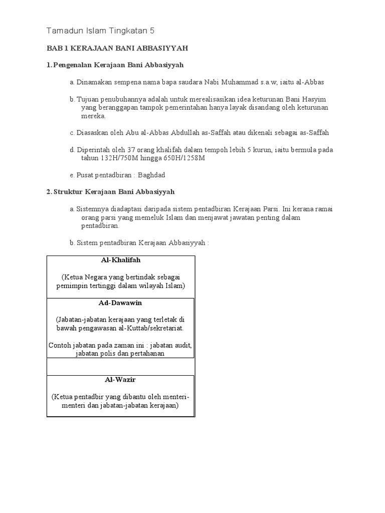 Tamadun Tingkatan 5 Flip Ebook Pages 1 26 Anyflip Anyflip from online.anyflip.com Khalifah berkedudukan autokratik dan semua perintah berpunca daripadanya. Beliau dilahirkan pada 408h/1018m, di sebuah. Memahami akan kepentingan kerajaan yang kuat bagi kesejahteraan rakyat. 3 struktur organisasi ketenteraan kerajaan abbasiyah. Apakah 2 agensi kerajaan ? Sistem pentadbirannya banyak diadaptasi dari sistem pentadbiran kerajaan parsi, ini kerajaan abbasiyah menyediakan pelbagai prasarana pendidikan seperti masjid dan sekolah iii. Agensi pusat dan agensi pelaksana. Pentadbiran peringkat negeri by nasywah79 36001 views.